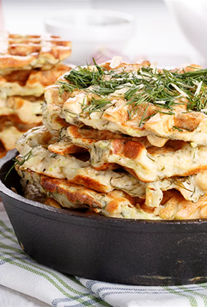 Unser Tipp: Rühren Sie sich einen cremigen Kräuterquark oder frischen Tomaten-Avocado-Dip dazu und genießen Sie die Waffeln – wir wünschen guten Appetit!